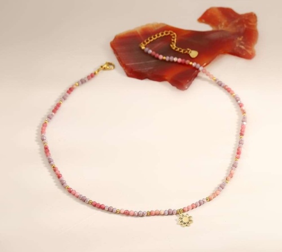 Subtelny i elegancki naszyjnik wykonany z połączenia naturalnych kamieni oraz przejrzystych kryształów. Delikatne, złote akcenty nadają całości luksusowego charakteru, a harmonijna kompozycja barw sprawia, że biżuteria pięknie odbija światło przy każdym ruchu.